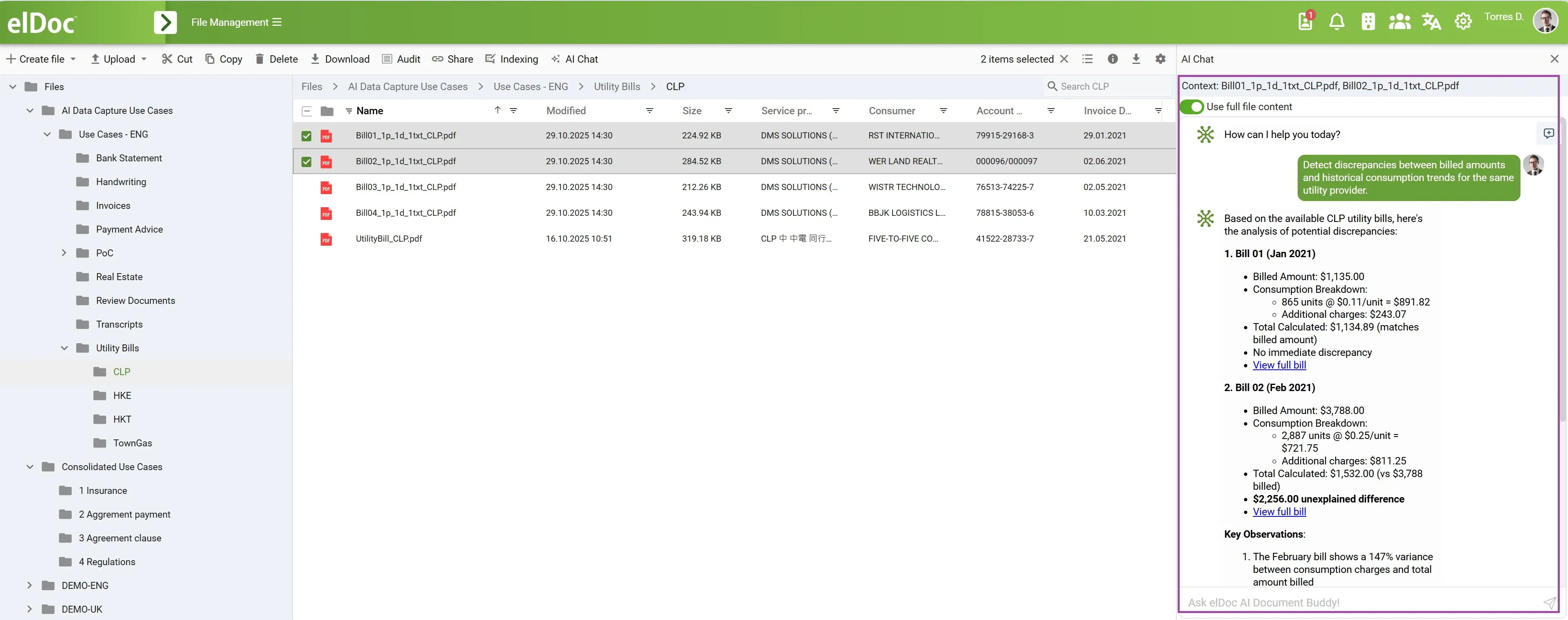More importantly, elDoc turns utility bills into actionable insight—helping you detect discrepancies, control costs, and respond faster, all by simply asking the right questions.