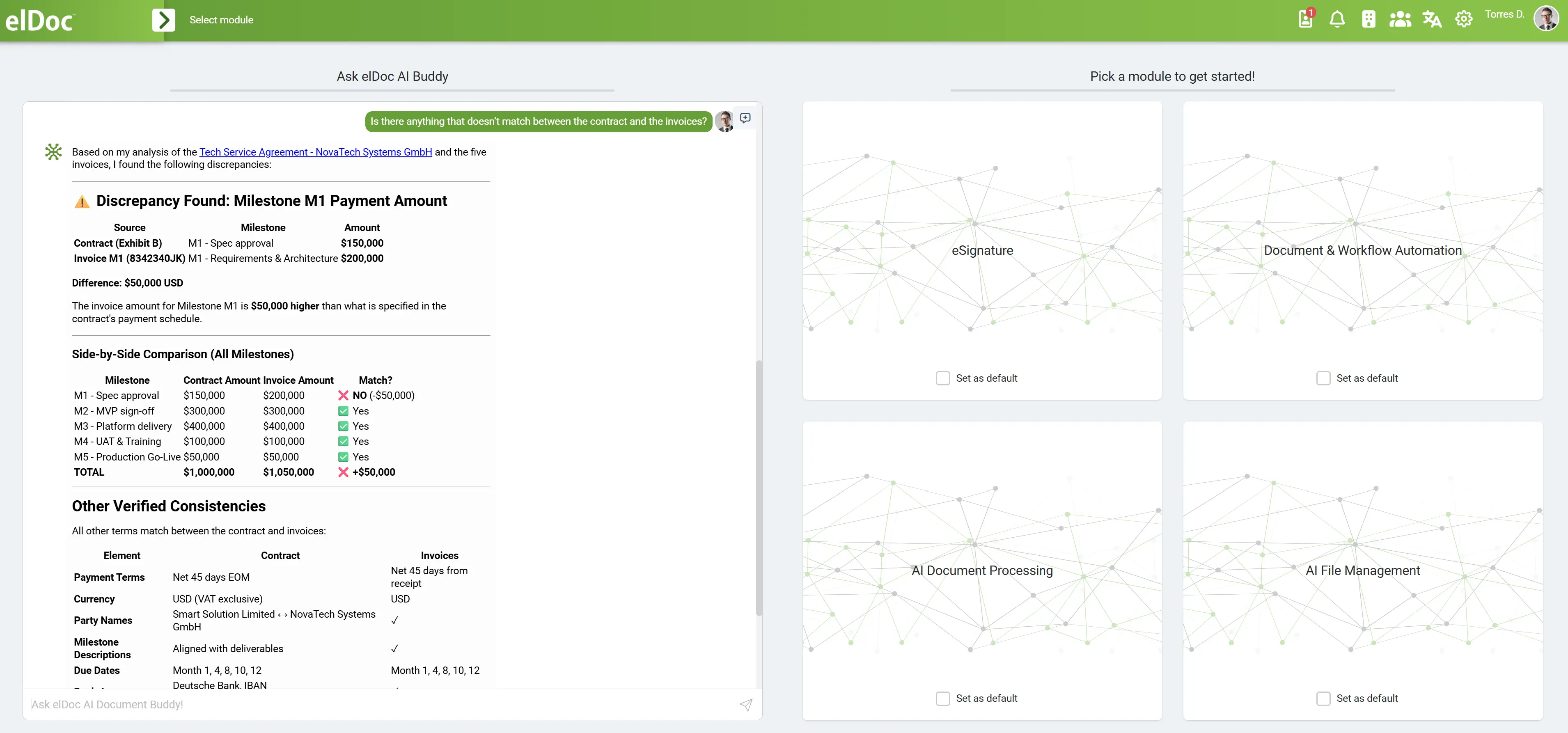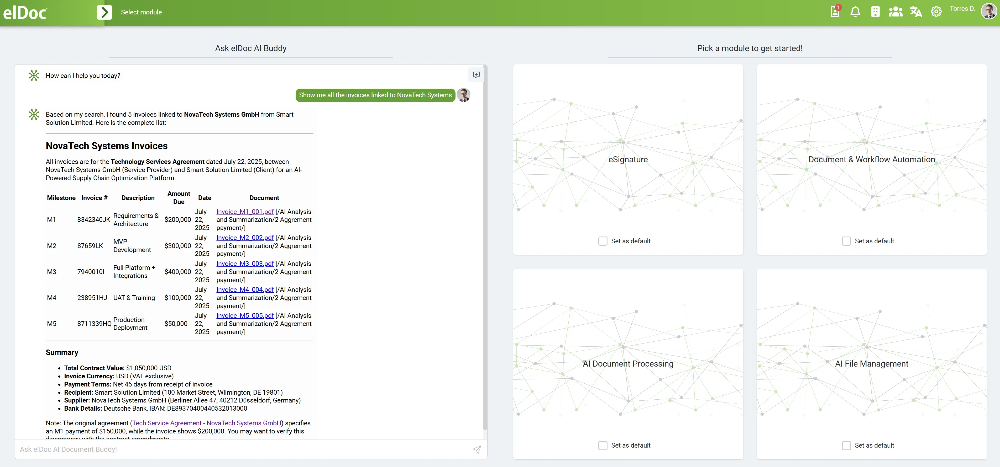 This multi-step approach enables elDoc to handle complex document-centric tasks – such as cross-document analysis, discrepancy detection, compliance validation, and completeness checks rather than simple question-and-answer interactions.