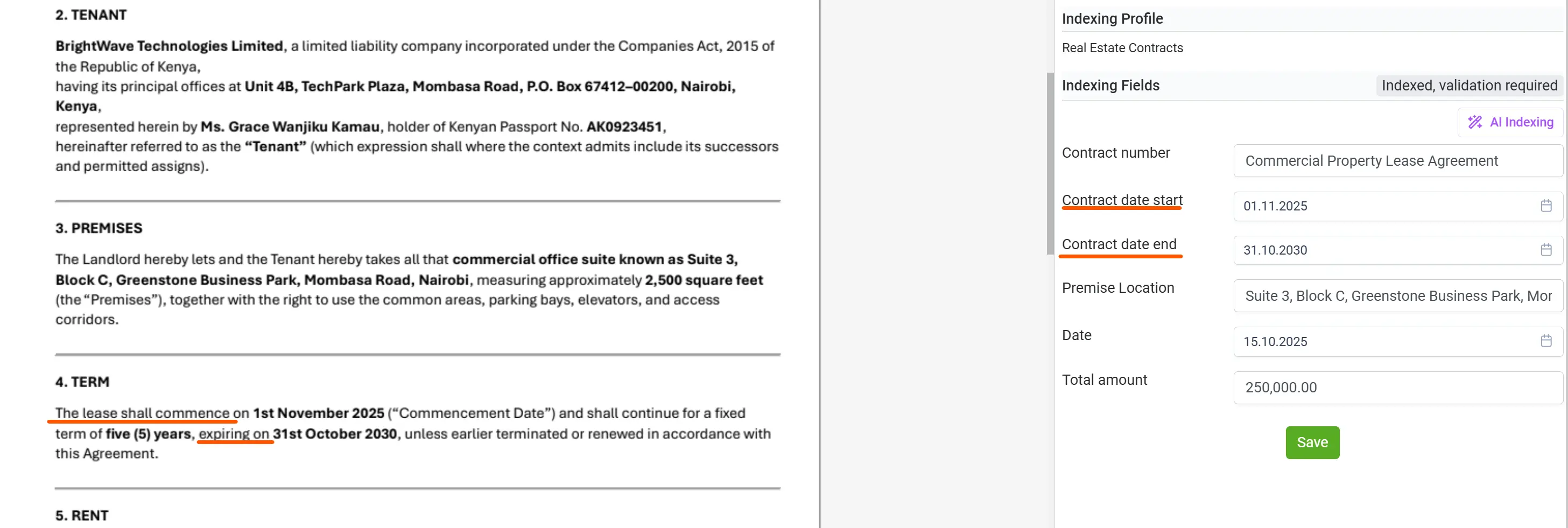Once the content is digitized, AI Indexing powered by LLMs analyzes and interprets the information with human-like understanding — identifying entities, relationships, and context across hundreds of pages. Even when data is written in natural language (for example, “payment due in thirty days from the invoice date”), elDoc can comprehend, interpret, and convert it into structured data such as exact dates, amounts, or terms. This advanced capability allows elDoc to read and understand documents as a human would, accurately capturing the meaning, intent, and relationships within unstructured content — and transforming it into structured, actionable insights instantly.