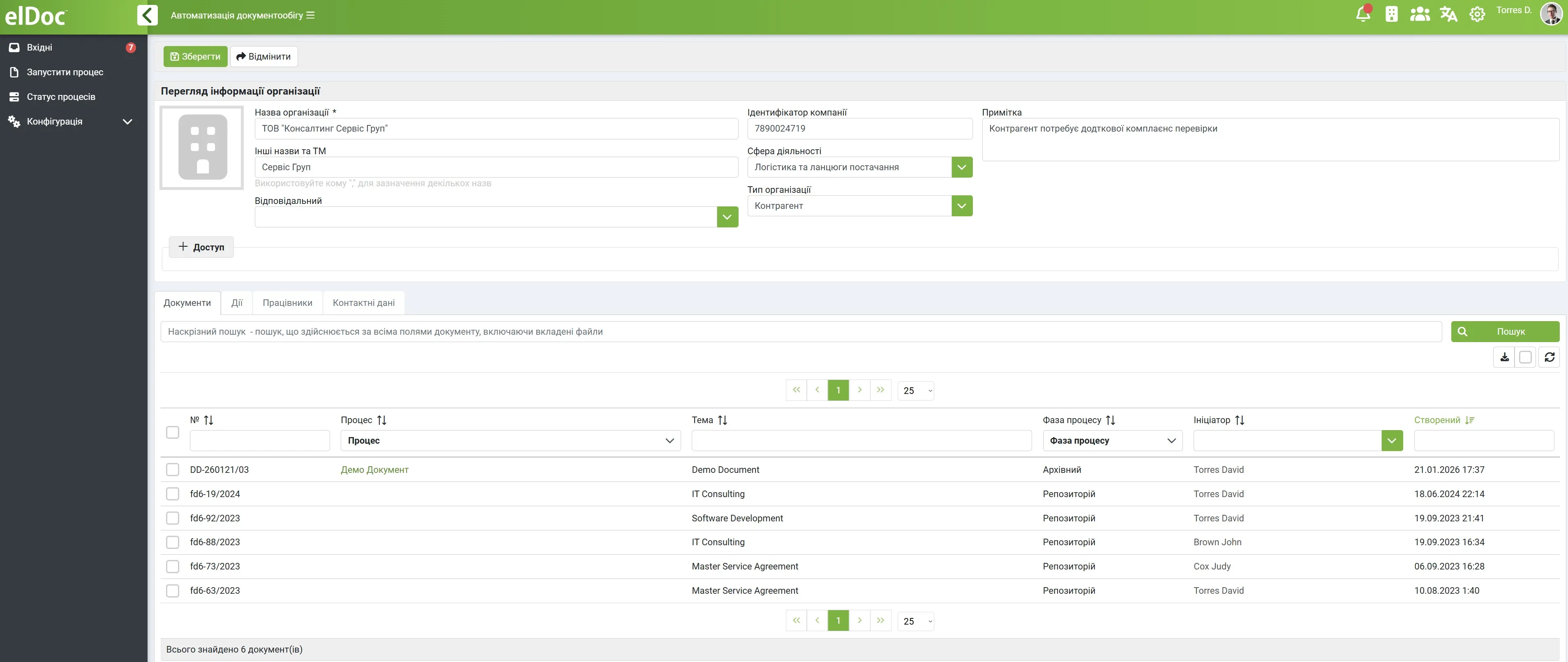 Контрагент задається один раз і використовується у всіх процесах внутрішнього погодження та зовнішнього підписання.