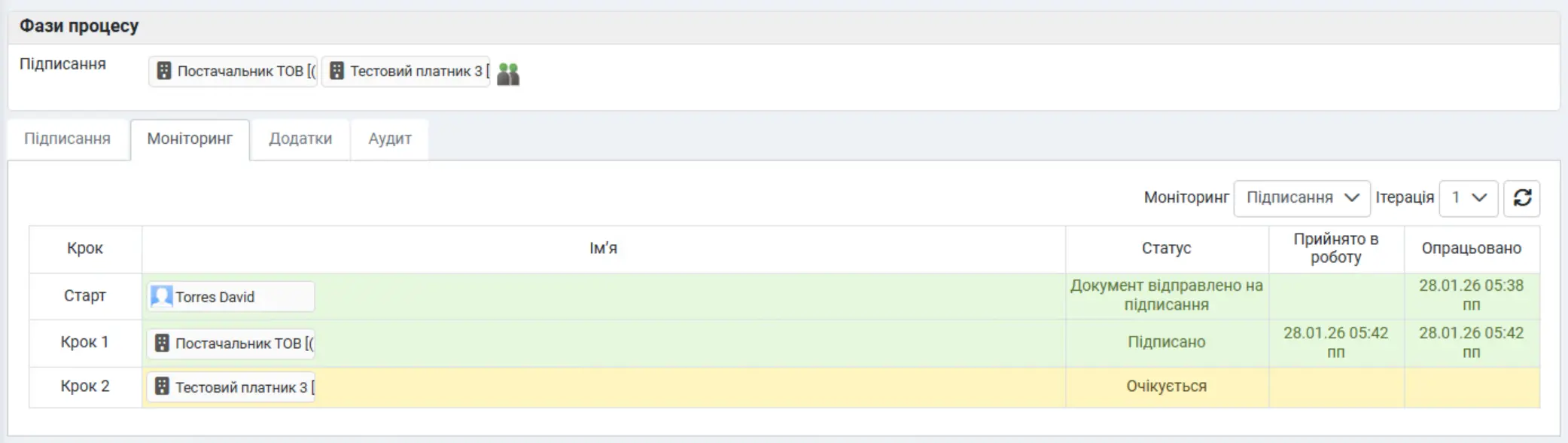 Наприклад, під час внутрішнього погодження учасники процесу можуть у вкладці «Моніторинг» відстежувати поточні статуси документа та хід узгодження в деталях: хто і коли взяв документ у роботу, які рішення були прийняті, чи було його відхилено або делеговано – з відображенням усіх подій у розрізі кожної ітерації процесу.