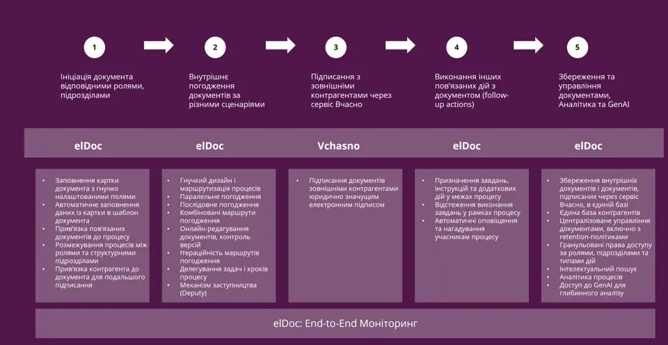 Такий підхід забезпечує цілісність процесу, зменшує операційні ризики та прискорює проходження документів від створення до юридично значущого результату – в єдиному керованому середовищі elDoc.