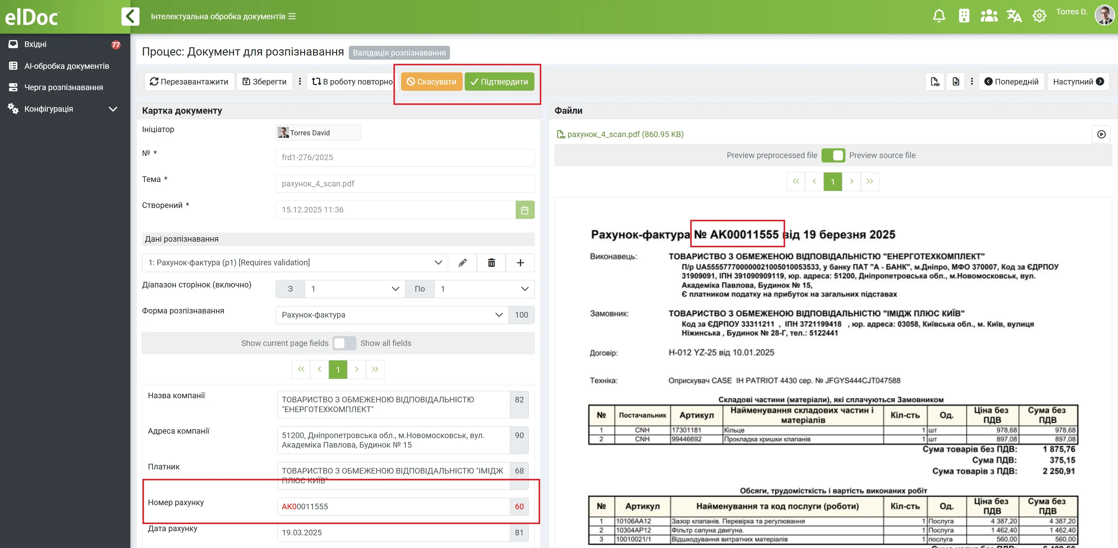 elDoc не лише зчитує дані, а й автоматично контролює їхню якість та коректність. Якщо з будь-якої причини частина інформації була розпізнана неточно — наприклад, через низьку якість скану, розмитий текст або нестандартний формат рахунку — платформа це виявляє.