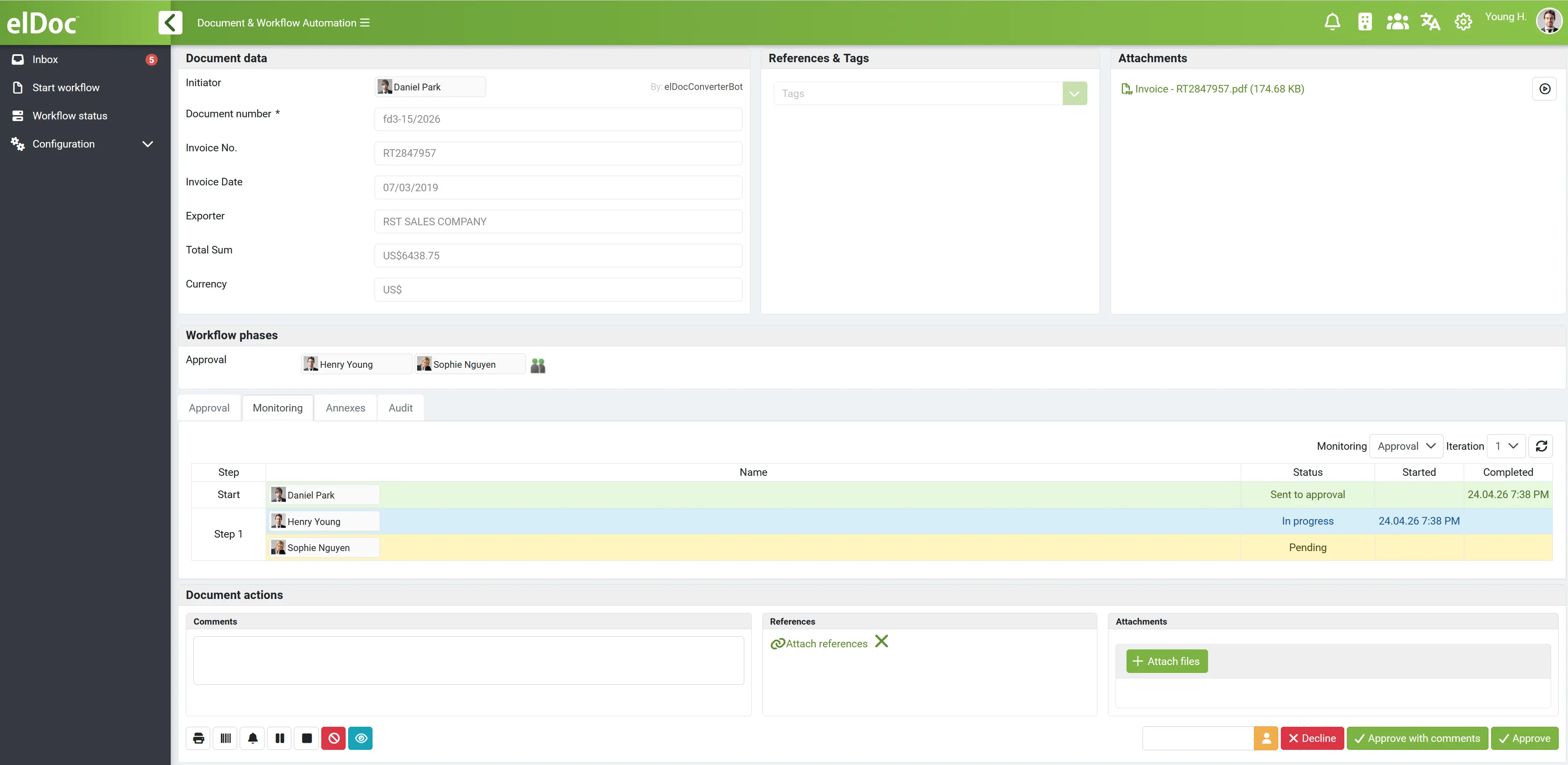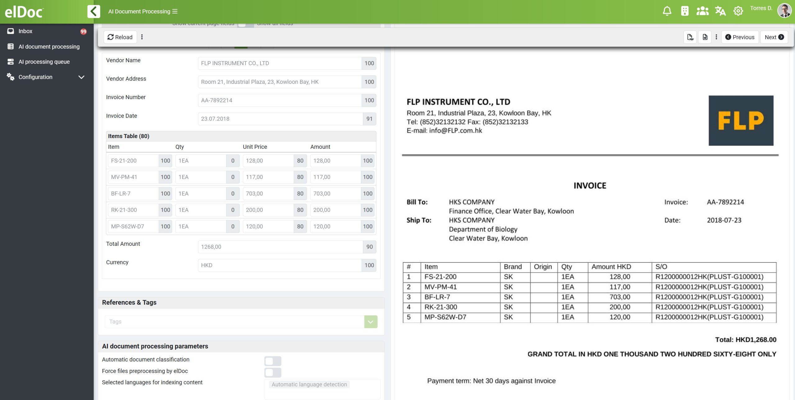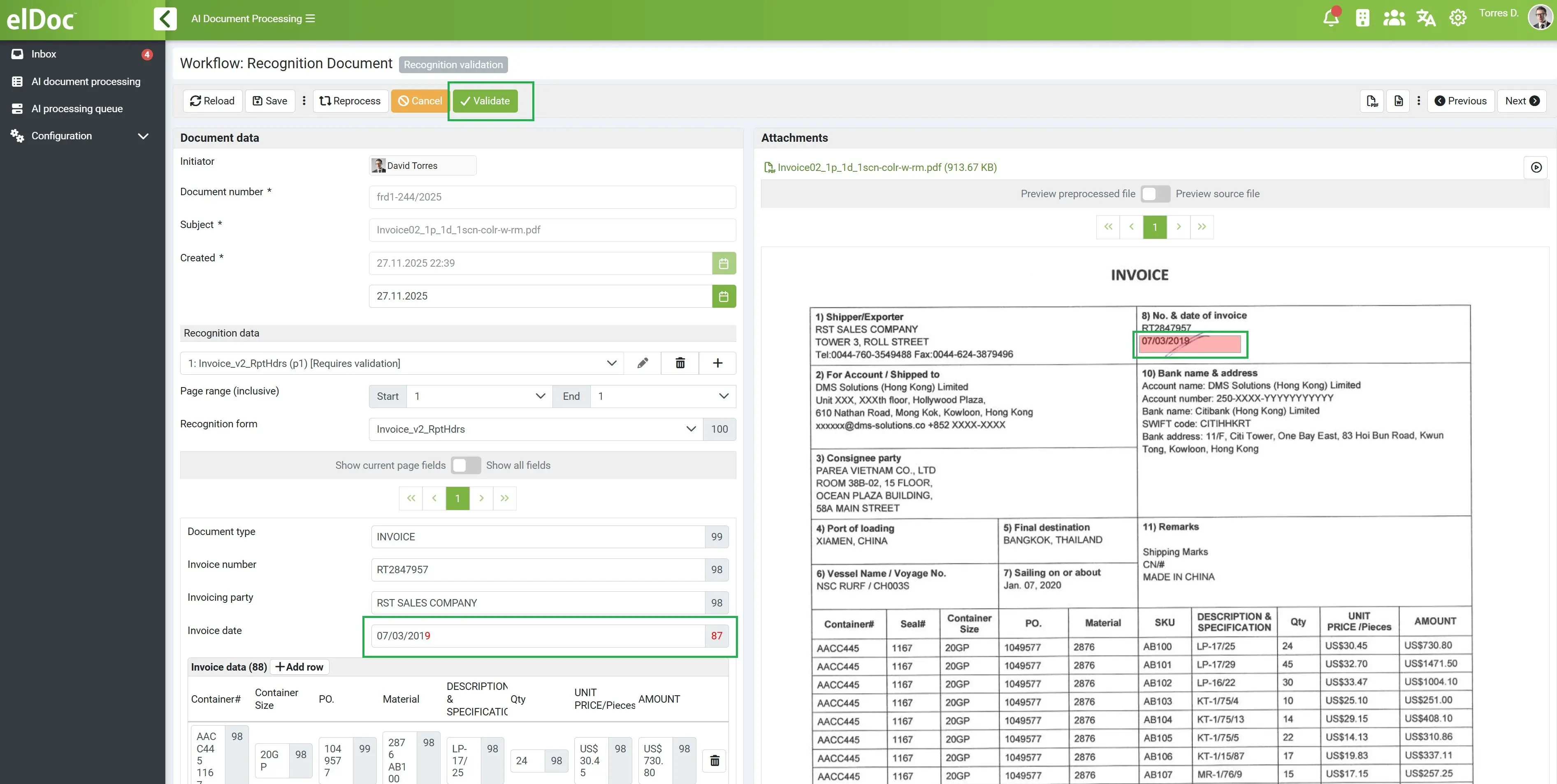 在自動化處理大部分發票流程的同時,elDoc 確保在真正需要時無縫引入人工監督。系統不會讓使用者參與每一個步驟,而是僅在例外情況下智慧觸發人工驗證,例如資料擷取信心度較低、違反業務規則、與採購訂單不一致,或出現異常交易模式時。